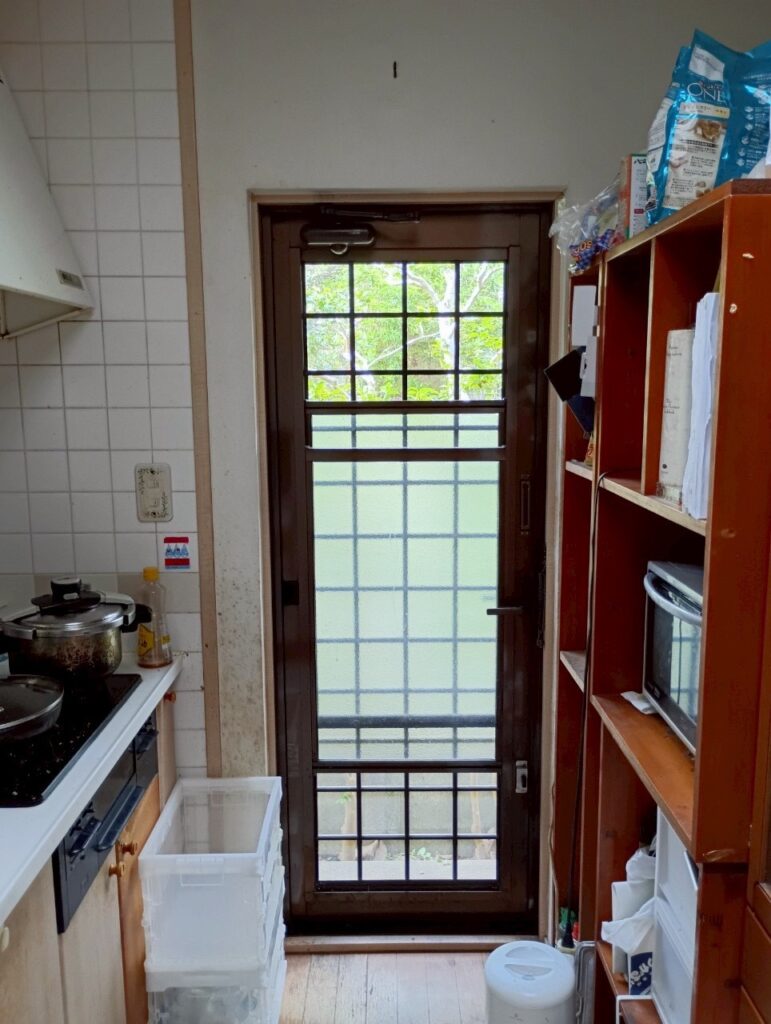 さらに年月の経過で勝手口に少しずつ歪みが生じ、上げ下げ窓が動かしづらくなっていました。
